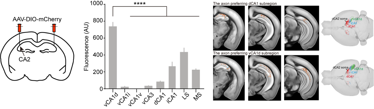 Figure 1: Preferential axon projections from dCA2 neurons to dCA1 and vCA1d.