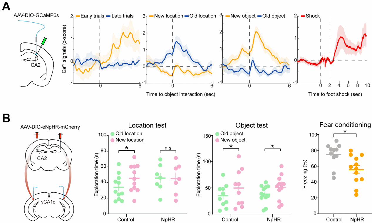 Figure 2: The role of dCA2 in spatial and context-dependent memories. A, dCA2 neurons showed specific calcium signal responses to object interaction and foot shock. B, inhibition of dCA2-vCA1d circuit impaired the location memory and fear memory of mice.
